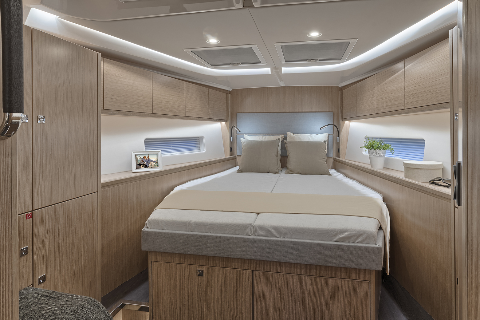 The C45 is the first boat of its class to incorporate an advanced Vessel Management System that controls all electrified functions from a touchscreen on the boat or from anywhere using a tablet . The system can alert you with a text message when your bilge pumps are running, or even when the boats moves from a predefined area (Geo-Tagging).