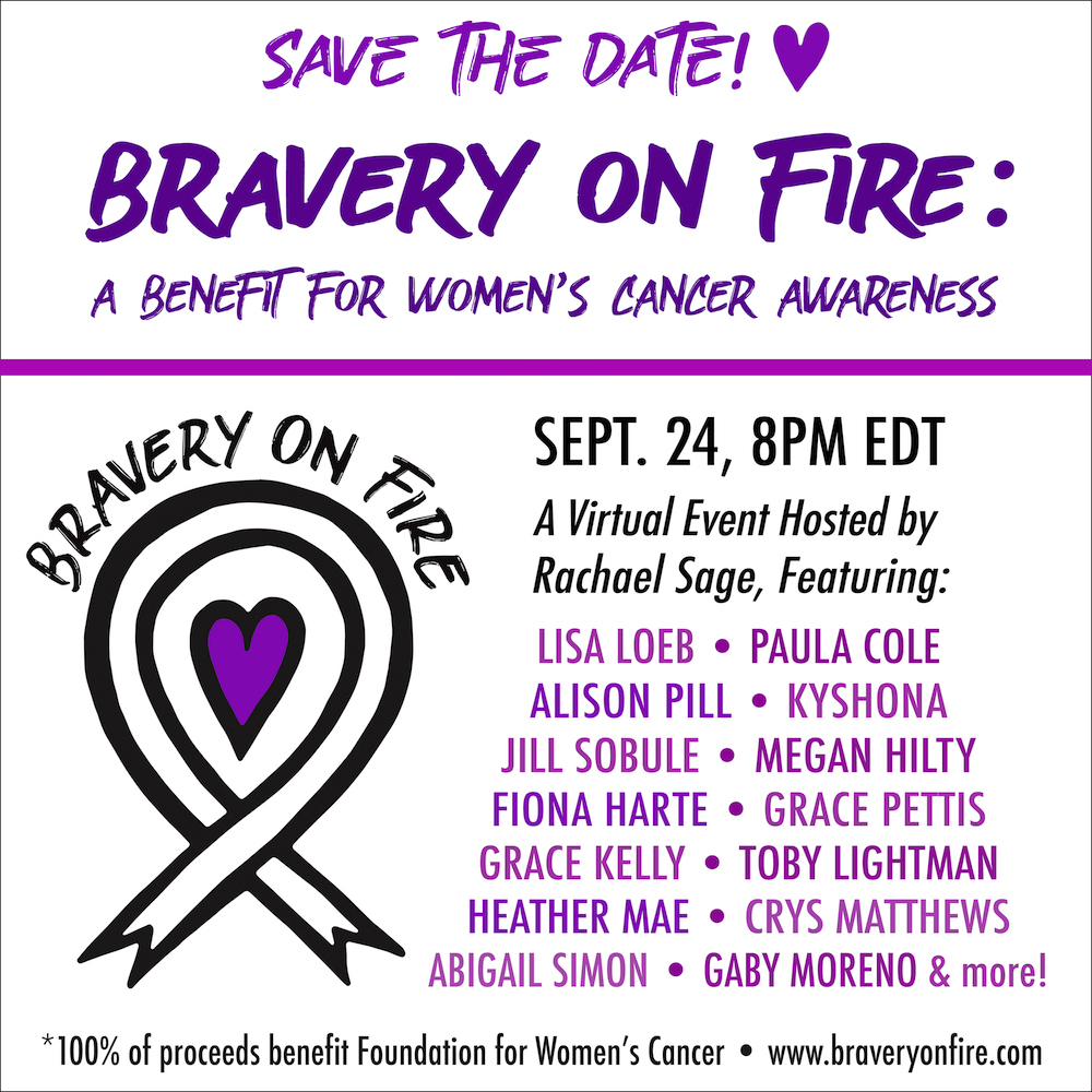 NEW YORK, September 9, 2020 (Newswire.com) - On September 24, singer-songwriter and self-described "cancer thriver" Rachael Sage will bring together a powerful group of performers for a great cause. Entitled "Bravery On Fire: A Benefit for Women's Cancer Awareness", the virtual event will raise funds for Foundation For Women's Cancer and will feature a variety of performers including Grammy® winners Paula Cole and Lisa Loeb, Tony-nominated Broadway actors Megan Hilty and Alison Pill, musicians Jill Sobule, Kyshona, Grace Pettis, and Heather Mae & Crys Matthews, Grace Kelly, Toby Lightman, Gaby Moreno, Fiona Harte, dancer Abigail Simon (see more at braveryonfire.com).