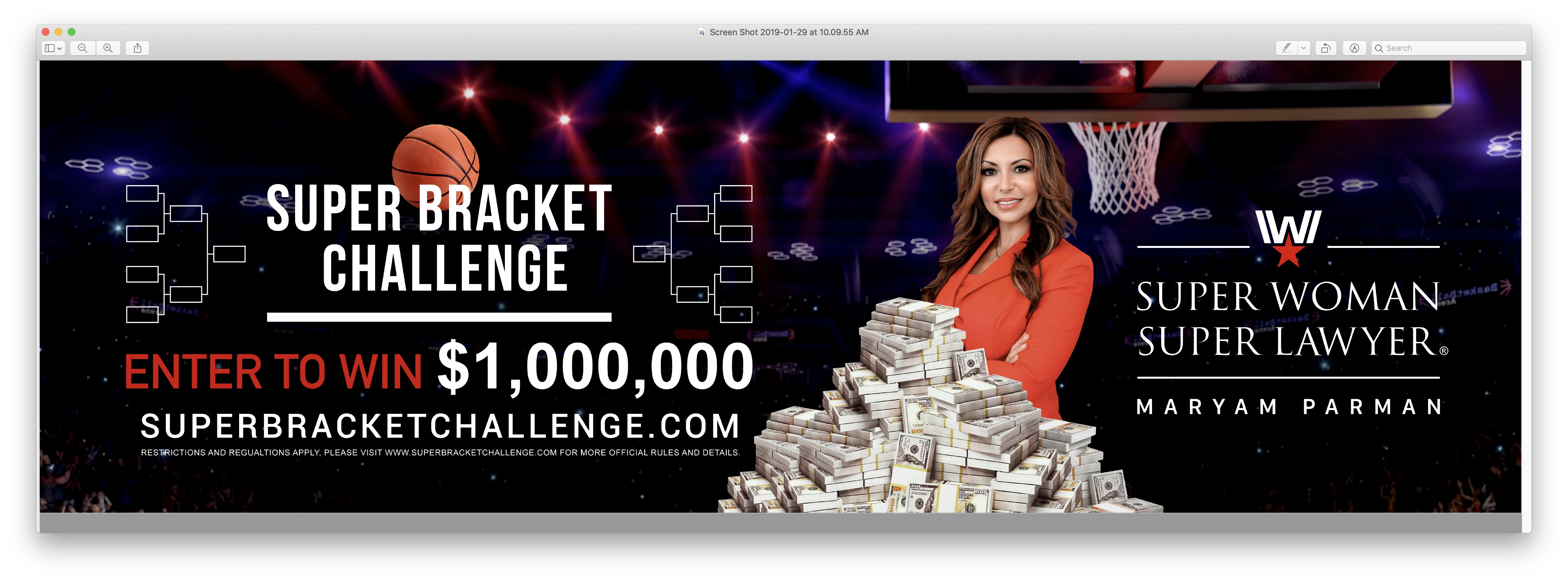 IRVINE, Calif., March 21, 2019 (Newswire.com) - SuperWoman SuperLawyer, Maryam Parman — a personal injury attorney and owner of Avrek Law Firm — is happy to announce that she is giving away $1 million to the winner of her Super Bracket Challenge for March Madness. In addition, she will be giving away $2,500 to the second-place winner, $500 to third place and $250 to fourth place of most correct brackets chosen for the college basketball tournament.