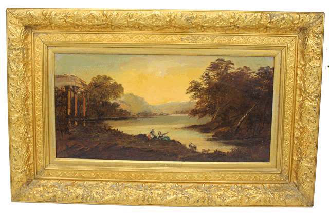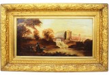 PHILIPPE JACQUES DE LOUTHERBOURG - OIL ON CANVAS Philippe Jacques de Loutherbourg (1740-1812). Oil on canvas painting signed bottom right "P J de L". Large gilt frame. Romantic landscape painting of a countryside waterfall with lovers on shore. Size: 32.5 x 20.5" including frame. Condition: VGC Est.$10,000 - 20,000