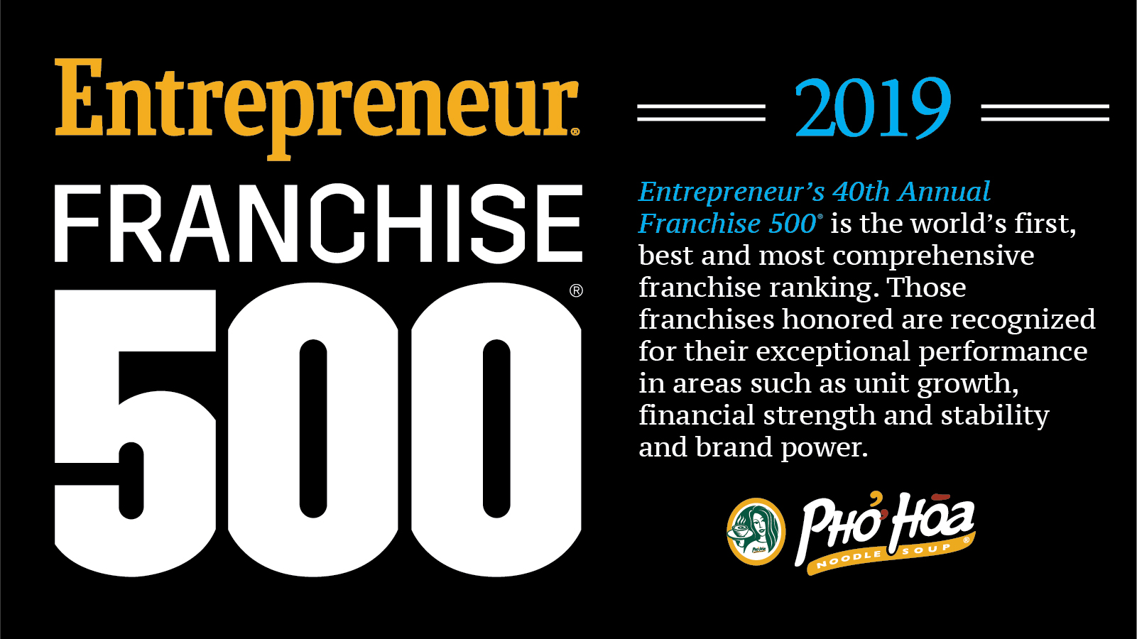 SACRAMENTO, Calif., April 30, 2019 (Newswire.com) - Pho Hoa Noodle Soup was recently ranked in Entrepreneur Magazine’s Franchise 500®, the world’s first, best and most comprehensive franchise ranking. Placement in the Franchise 500® is a highly sought-after honor in the franchise industry, as evidenced by the fact that Entrepreneur received more than 1,000 applications this year, making it one of the company’s most competitive rankings ever.
