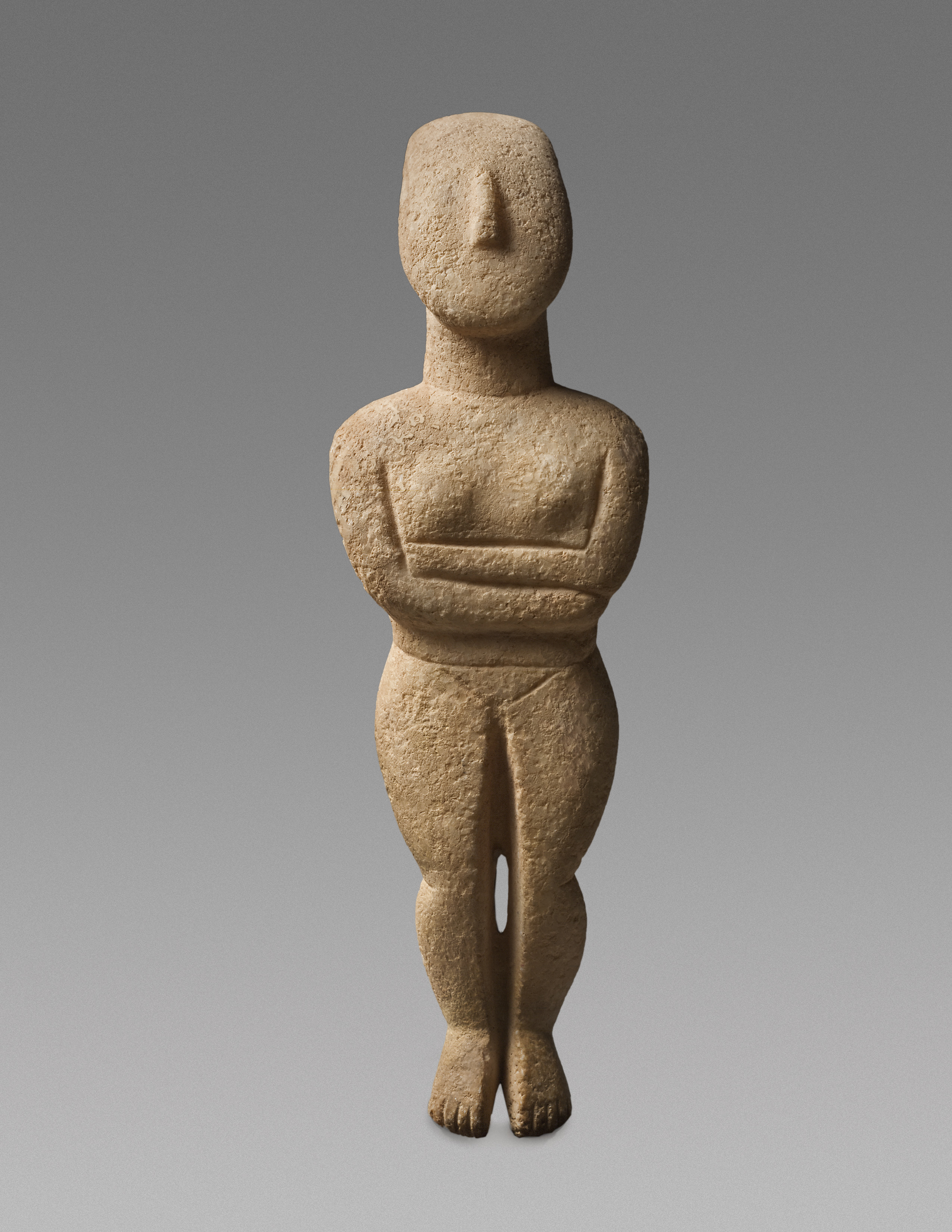 One of the highlights of the SOFA Chicago show is a Cycladic "Idol" of the Early Spedos Variety from 2700-2600 B.C. standing at 8 and 3/4 inches high. The highly imposing qualities make this marble figure a remarkable work of Cycladic sculpture. The study of it designates a specific type in the representation of a nude human figure (which appears standing in a contemporary display) and recognizes it as belonging to a variety of the Canonical type (a folded-arm figure): Early Spedos.