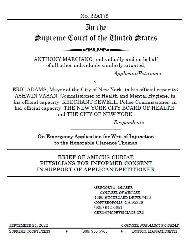 NEWPORT BEACH, Calif., September 27, 2022 (Newswire.com) - Physicians for Informed Consent (PIC), an educational 501(c)(3) nonprofit organization focused on science and statistics, has filed an amicus curiae brief in support of the right of municipal workers to informed consent, and its corollary informed refusal, in vaccination. The case of Marciano v. Adams (United States Supreme Court Case Number 22A178) was submitted to Justice Clarence Thomas and is scheduled for Supreme Court conference on Oct. 7, 2022. If a total of four Justices agree to hear the case at that time, then further briefing will be scheduled this fall 2022.