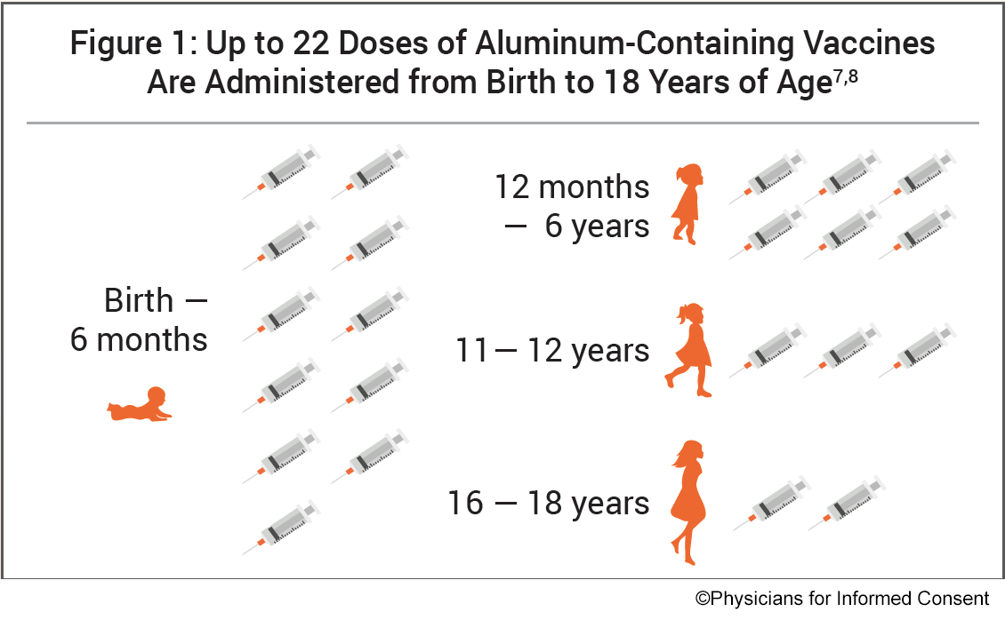 Studies have also shown that adverse effects of aluminum may not be restricted to neurological conditions.* A study referenced in the PIC document and published in Academic Pediatrics found that asthma occurred in 1 in 183 vaccinated children for every 1 mg (1,000 mcg) increase in aluminum exposure. In the United States, up to 22 doses of aluminum-containing vaccines are administered to children, with 11 doses administered from birth to 6 months of age.