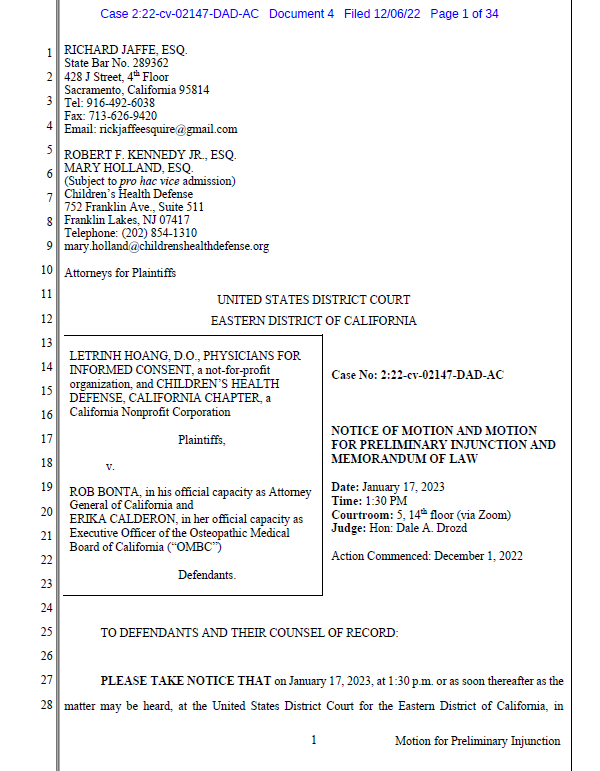 The Plaintiffs are PIC and one of its founding members, physician LeTrinh Hoang, D.O., together with Children's Health Defense, California Chapter. The legal team managing the case are Rick Jaffe, Robert F. Kennedy Jr., and Mary Holland.