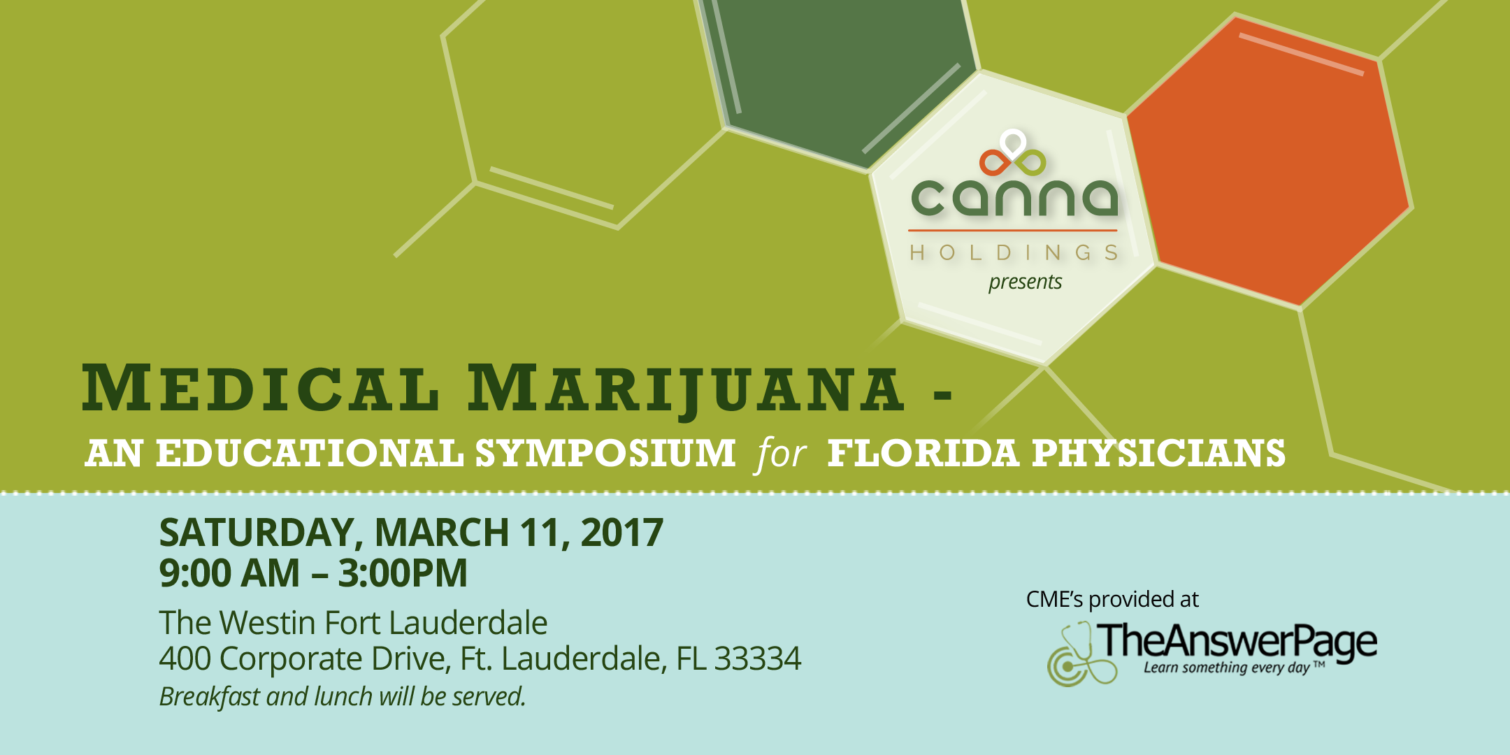 The symposium is scheduled for Saturday, March 11, 2017 at The Westin in Fort Lauderdale. Registration will begin at 8am and the event ends at 3pm. Tickets can be reserved prior to the event at CannaHoldings.com. Limited tickets are available for this exclusive event on a first come, first serve basis. Attendees will have access to TheAnswerPage.com’s medical cannabis CME on-line library and can earn up to 6 CME credits.