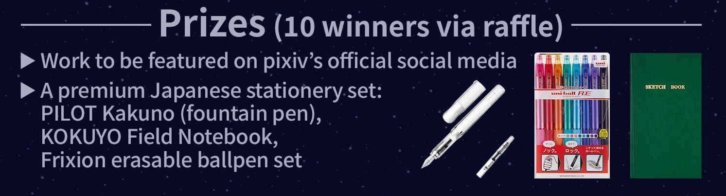 Selected works will be showcased on pixiv's official accounts (X, Weibo, Facebook, etc.) based on the language of submission.A curated set of premium Japanese stationery