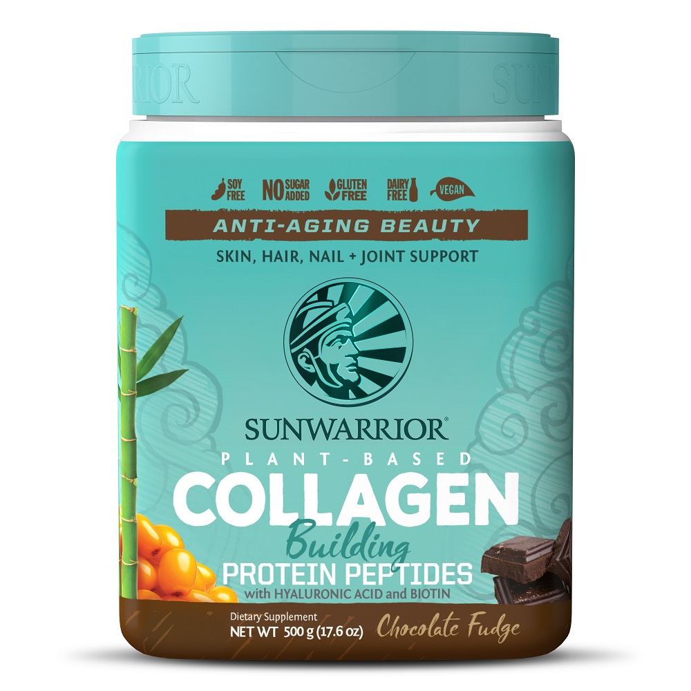 Sunwarrior's plant-based collagen building protein peptides comes in two flavors; Tahitian Vanilla and Chocolate Fudge. It is non-GMO, soy-free, gluten-free, sugar-free, and dairy-free, with most ingredients being organic.