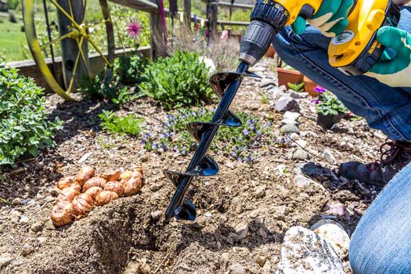 - Dig a hole for each bulb. To make the job easier, use a handy planting tool called the DIY Guru Auger from www.PowerPlanter.com. This tool fits right into a hand-held power drill, and it quickly drills holes into the soil that are perfect for planting fall bulbs. (The tough steel DIY Guru Auger is also great for other jobs around the house and garden like mixing gallons of paint or batches of fertilizer.)