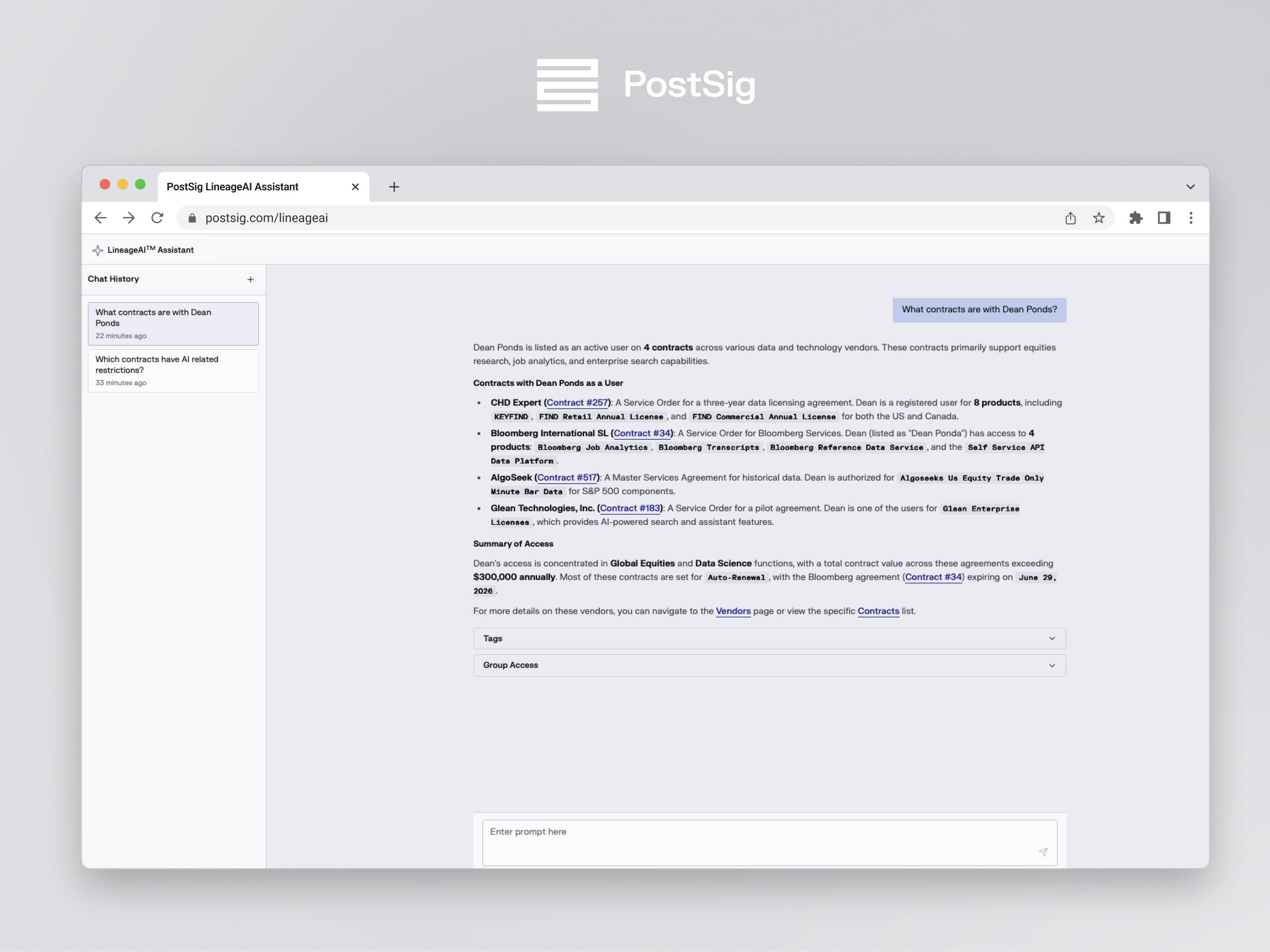 "Organizations already know the answers are somewhere in their documents. They just spend an enormous amount of time hunting for them, reconciling them, and figuring out what actually applies today," said Hendrik Bartel, CEO and co-founder of PostSig. "LineageAI understands how agreements, amendments, and related records change over time. The Assistant makes that intelligence immediately accessible, so teams can move from searching to deciding in seconds."
