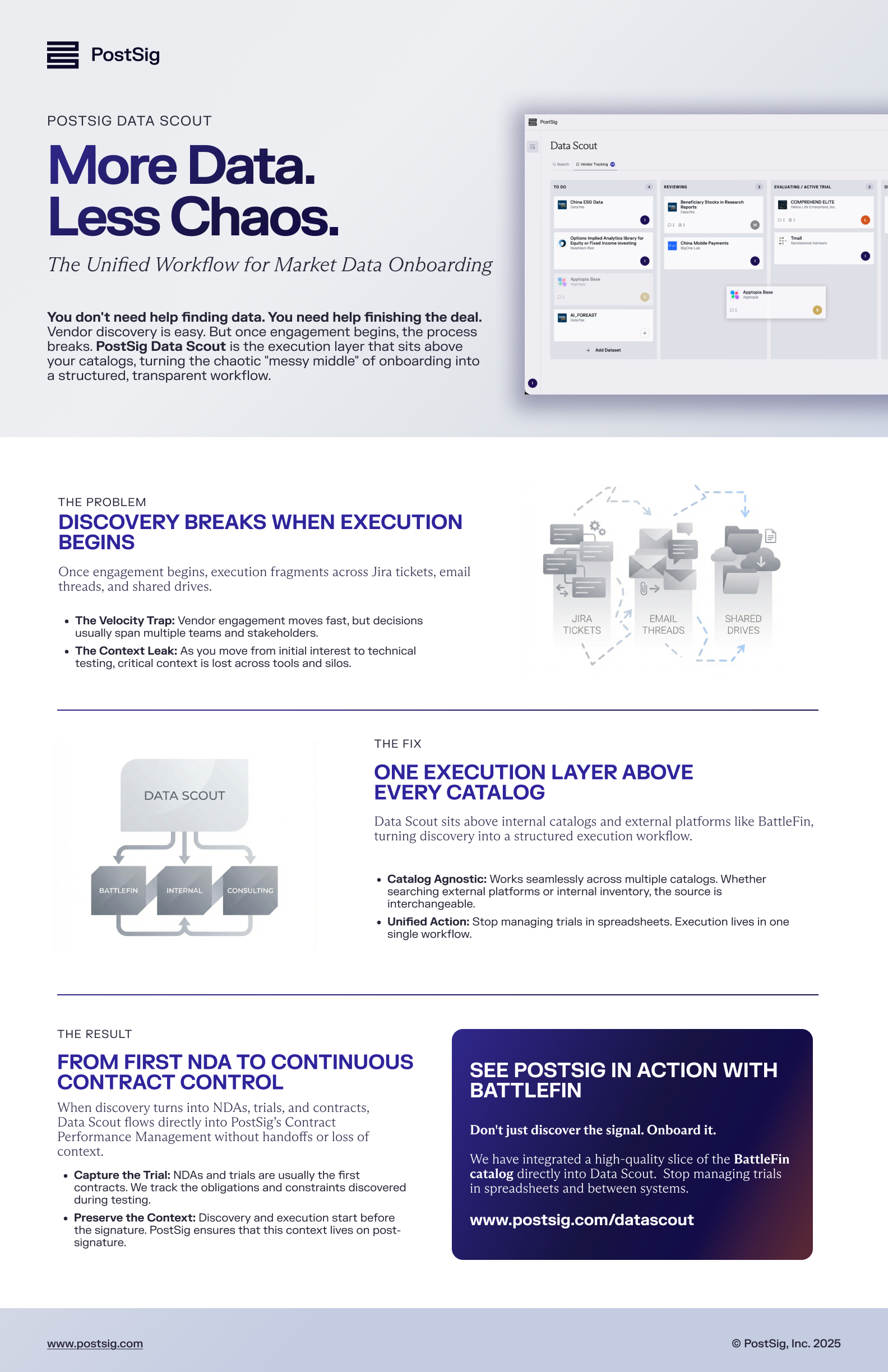 "Data Scout is not another data catalog," said Phil Kim, Chief Product Officer at PostSig. "Firms already have multiple ways to discover data. What's been missing is a system that connects discovery to execution. Data Scout sits above internal and external catalogs and brings structure to everything that happens once interest turns into action."