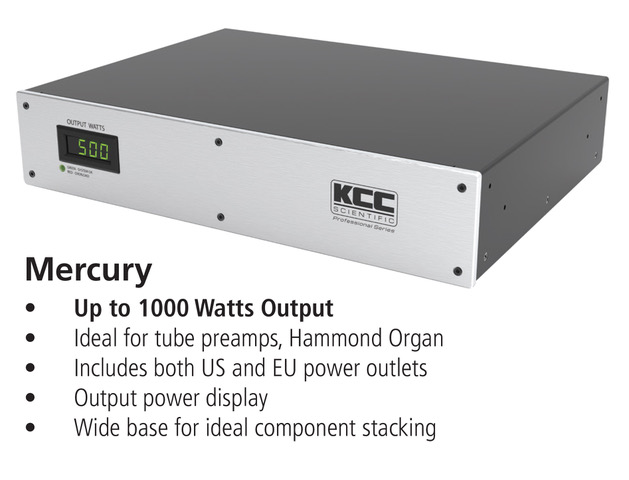 Mercury is a KCC Scientific Professional Series innovation, incorporating features such as separate 115V and 230V AC outlets, output power display, wide base dimensions for ideal component stacking, and more. Customers experience turntable speed precision with distortion-free sound and minimized ground loops. The benefits apply to both vintage and contemporary audio equipment.