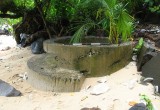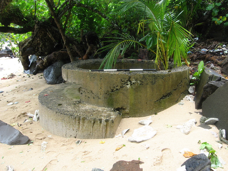 The World War II pill boxes Tutuila are tactically placed with one located directly in the center of the beach and the other positioned to the east further away from the coastline in heavy vegetation. The placement of these fortifications would have permitted cross fires on attacking enemy and a mutual defense along an expanse of shoreline that was very shallow at low tide. During World War II, Japanese landing craft would be blocked by the sudden elevation of the basaltic shelf several hundred meters from the shoreline and would then face weapons fire from one visible fortification and then another well-hidden pillbox toward the eastern edge of the shore..