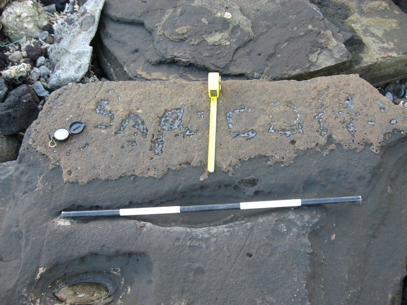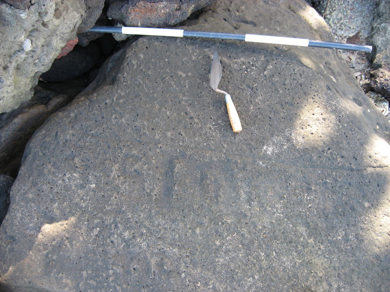 Some of the inscriptions from Afao appear to be from World War II as evidenced by their proximity to a Marine Corps camp during this era, two defensive fortifications at the site, subject matter of the inscriptions and the testimony of local villagers. The inscriptions from World War II were carved into a naturally occurring flat rock that was undercut by beach erosion. This basaltic promontory collapsed and was subject to further wave activity. Due to these environmental processes some of the inscriptions are barely visible while others portray clearer verbiage. According to the villagers from Afao, the inscriptions are from World War II. Also, units of the Marine Corps' 7th Defense Battalion bivouacked in Asili, an adjacent town less than a mile away from Afao. Further, two pill boxes from World War II are evidenced in this area. Inscriptions appear in the rocks in close proximity to the pill boxes and denote "USMC" [United States Marine Corps], a construction company and other verbiage.
