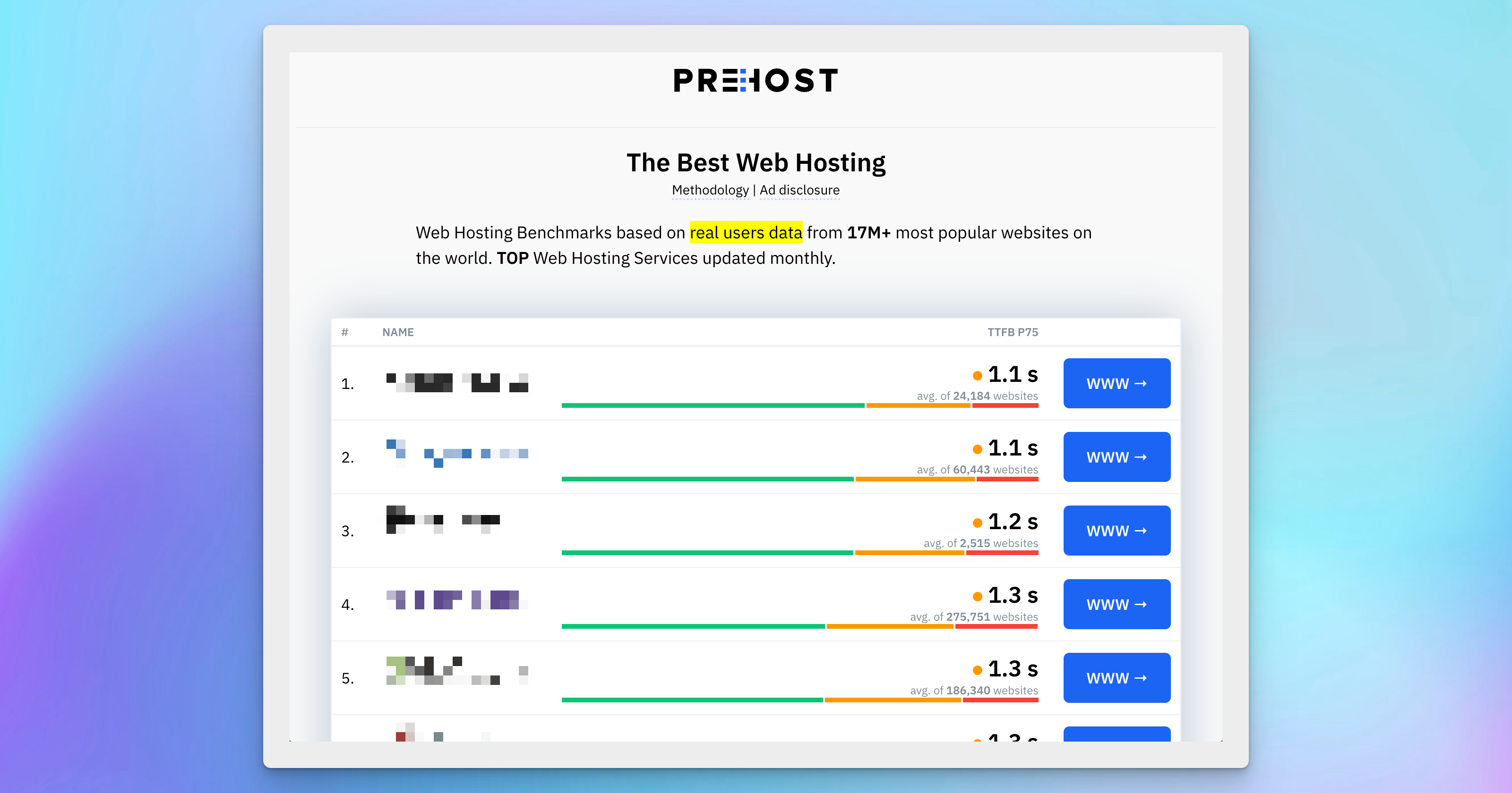SAN FRANCISCO, May 20, 2024 (Newswire.com) - The new service Prehost.com reveals the true performance of web hosting services. Using data from real user visits on over 17 million of the most popular websites, Prehost offers reliable benchmarks focused on the key speed parameter – TTFB (Time to First Byte).