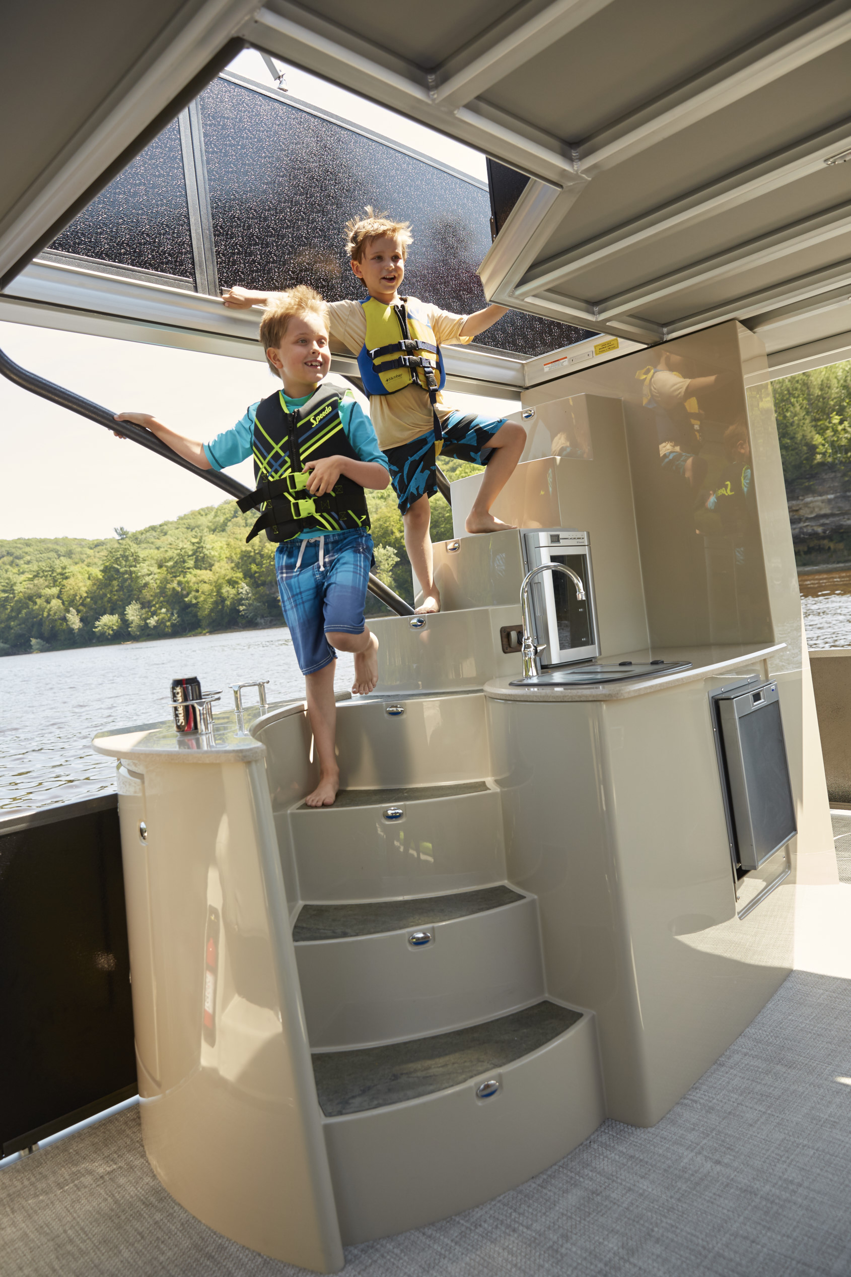 “This model is the ultimate pontoon for families who love to entertain and take advantage of everything boating has to offer,” says Premier president Lori Melbostad. “The stairs leads to the center of the upper deck where there’s a slide, two lounge couches, and the best views on the lake.”
