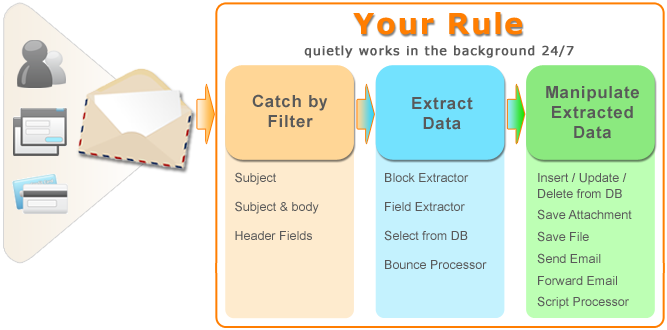 G-Lock Email Processor can read messages from POP3 and IMAP mailboxes, filter the messages by different conditions, extract any data from the message body, message header, and text attachments and save the data to a file, or to a database. The program can work with any ODBC compatible database.