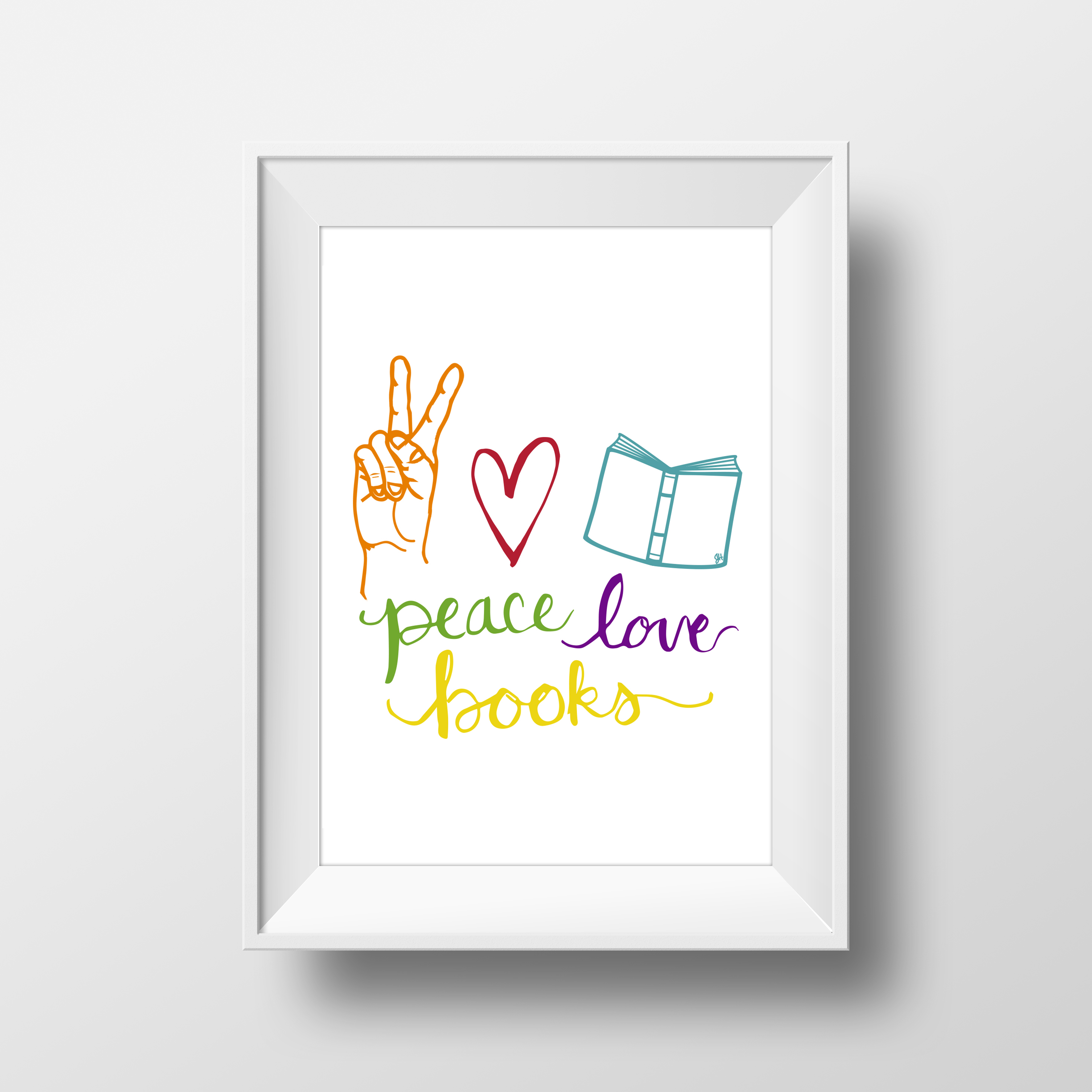The Joy at Home “Peace, Love, Books” Collection features the phrase “Peace, Love, Books” in a variety of colors and mediums. This cute and symbolic take on the popular phrase will resonate with all ages. Joy actually drew the design by hand, making it a completely unique design. The “peace sign” symbol is even a drawing of her oldest daughter’s hand. These personal touches give this collection a cozy and homemade feel that can't be found in stores. This design is featured as a multi-colored design for wall art, as well as several other color choices, including white on blue, white on gray, white on coral, black on white, and white on black for pillows or wall art.