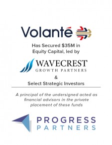 “While we are pleased with the end result of this capital raise, we are equally as impressed with the process that led to this positive outcome,” commented Harp Grewal, Volante’s Chief Operating Officer. “The Progress Partners team was attentive, thoughtful, and there for us every step of the way. Progress provided meaningful guidance and contributed many insights necessary to help us bring this round to a close.”