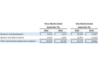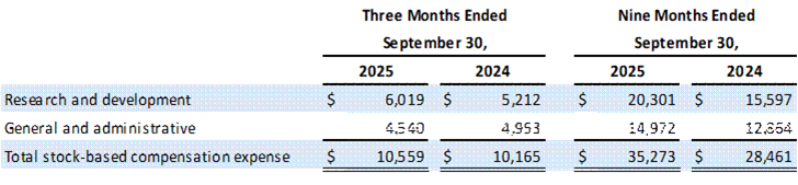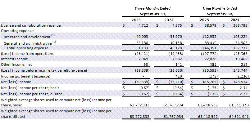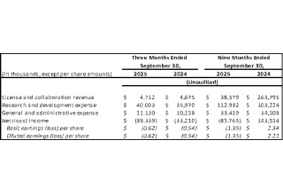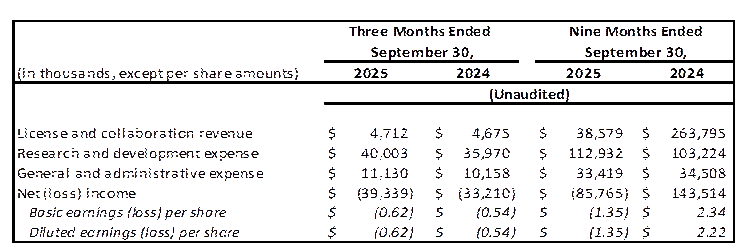 General and Administrative ("G&A") Expenses : Increased by $1.0 million for the three months ended September 30, 2025, from the prior year period primarily due to increases in professional services. The decrease of $1.1 million in G&A expenses for the nine months ended September 30, 2025, from the prior year period was primarily due to $4.6 million in one-time advisory and legal fees related to the Takeda collaboration in Q1 24, partially offset by increases in personnel-related expenses and professional services.