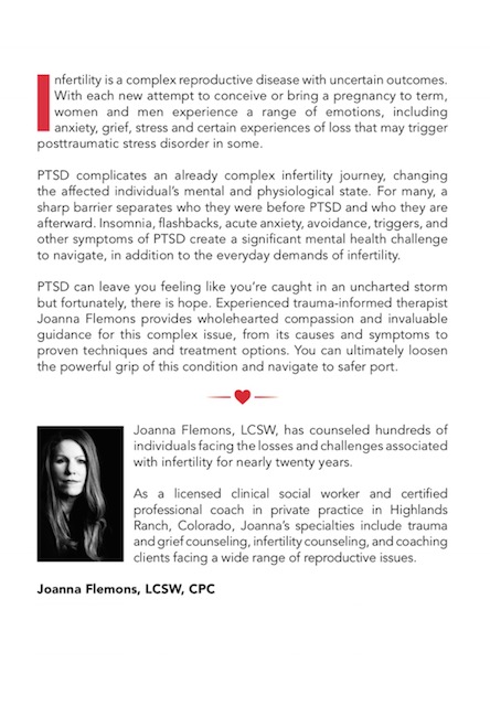 Joanna Flemons is the owner of Highlands Ranch Counseling and Coaching and is a member of the American Society for Reproductive Medicine and the International Association of Trauma Professionals (IATP). For more information, visit HighlandsRanchCounselingandCoaching.com.