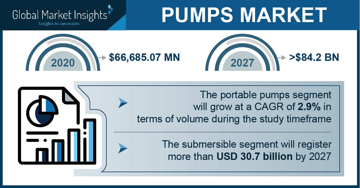 SELBYVILLE, Del., July 13, 2021 (Newswire.com) - Global Market Insights Inc. has recently added a new report on the pumps market which estimates the market valuation for pumps market will cross US $84.2 billion by 2027. The product demand will grow at a significant rate due to the rising activities of water & wastewater treatment, oil & gas exploration and production, and general industries in developing nations.