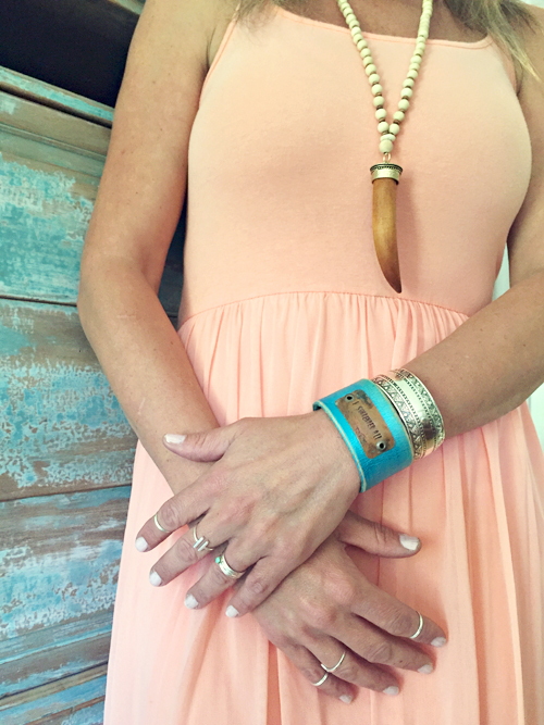 The Silver & Spice Collection begins at its very roots, its materials. Rich supple leather, sterling silver, and earthy turquoise became the foundation for her to create a fabulous collection of simple silver accessories, stacking and turquoise rings, hand stamped leather bracelets, necklaces, and more.