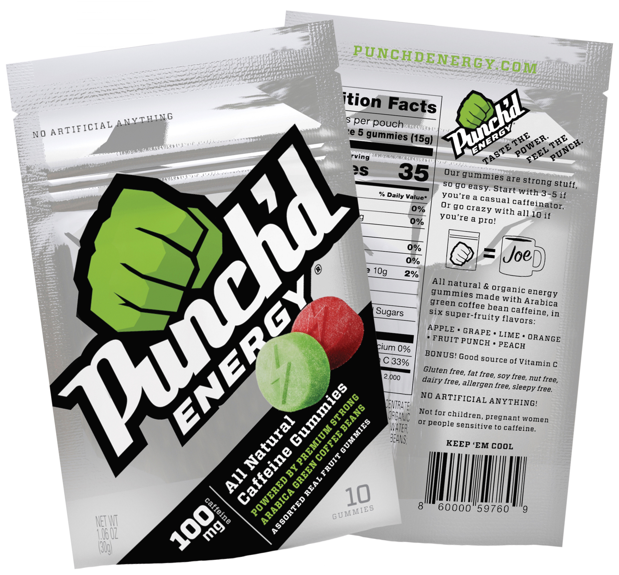 This is the real deal, as in real ingredients. Tasty real superfruits and Vitamin C infused with strong premium natural Arabica green coffee bean caffeine. No Artificial Anything. Punch'd Energy received a US Patent for this composition of natural caffeine and fruit gummies.