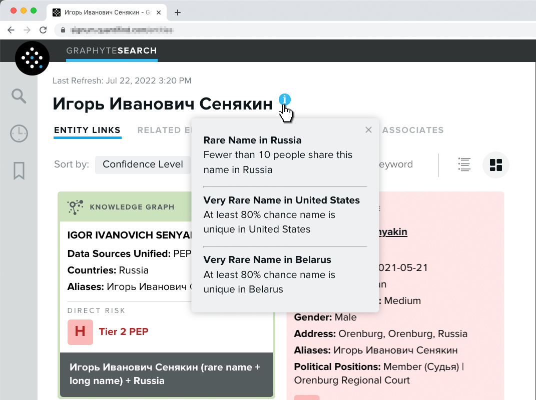 Quantifind's Graphyte platform understands names as data and is built to leverage these factors to derive better insights and information, Tuchman said. For example, Graphyte understands linguistic groups and applies that data-driven ability to processes like global name parsing, breaking a name into its components. It employs phonetic algorithms to assess variations in how a name is spelled. It also utilizes associated metadata like birth year, location or employer in the name-entity linking process.