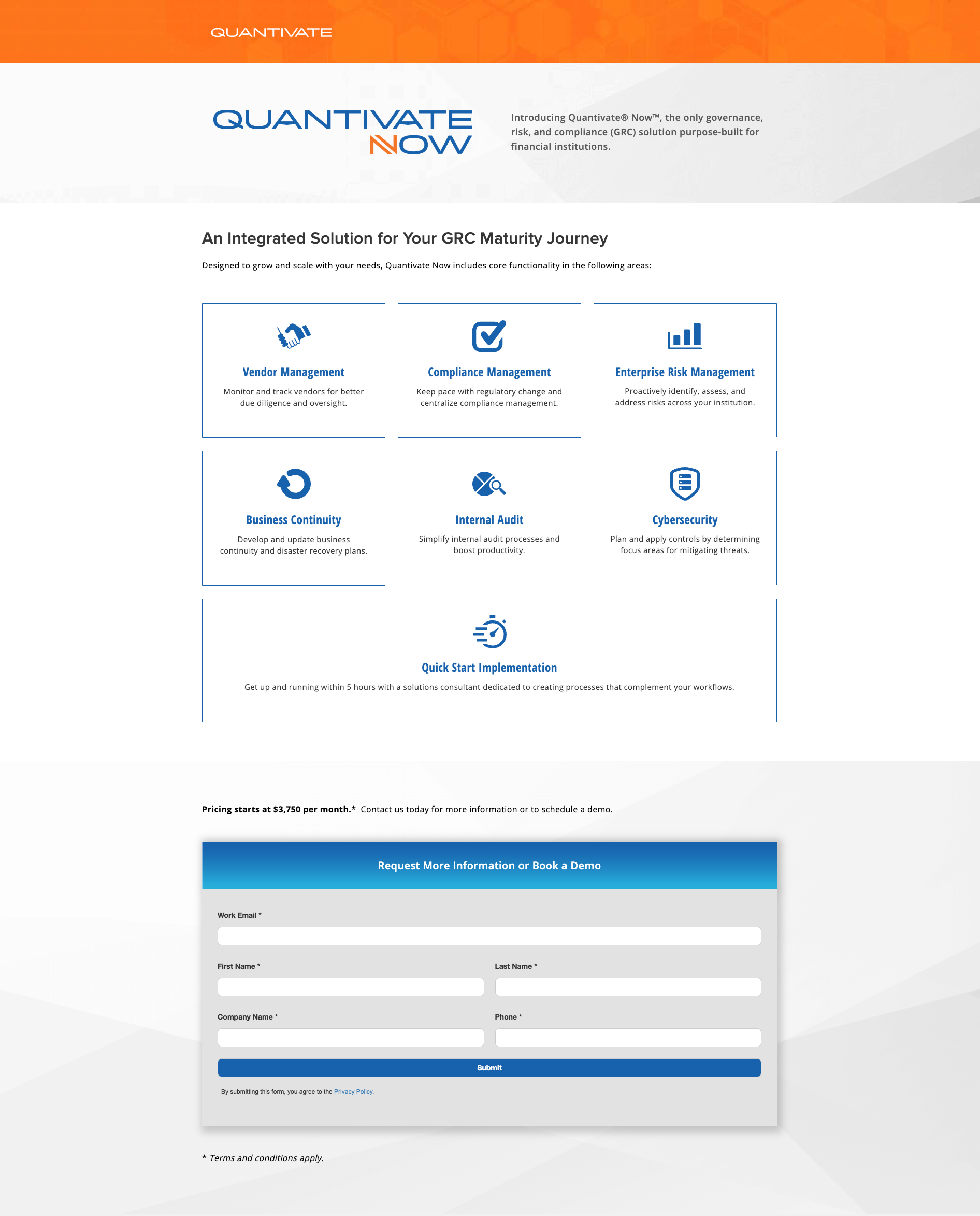Quantivate Now gives financial institutions the ability to ramp up quickly in core risk and compliance disciplines with an integrated technology platform. The solution provides an entry point for firms seeking to develop or formalize their GRC management capabilities, eliminate manual processes, and integrate across functions.