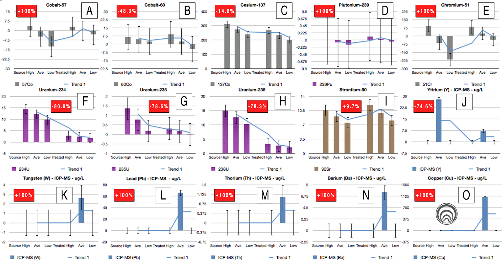 Figure 3: The Source and Treated ICP-MS values of nuclear wastewater. Lab grade deionized water was laced with Cs-137, Uranium-234/235/238, Strontium-90, and Yttrium-90. White is zero values, Blue is growth, Red is reduction, Green is source values.