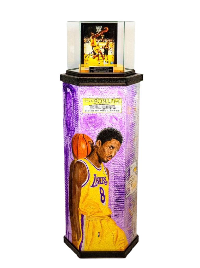 During the global pandemic, this creation became self-care for the artist who redirected his focus, instead of capitulating to anxiety. The one-of-a-kind pedestal piece to be auctioned is captured in oil, colored pencil, and oil pastel on wood, showcasing a signed 8x10 NBA-licensed photograph of legend Kobe Bryant in action at the Los Angeles Forum. The photo bears a strong signature from Kobe, autographed by the late NBA star early in his career.