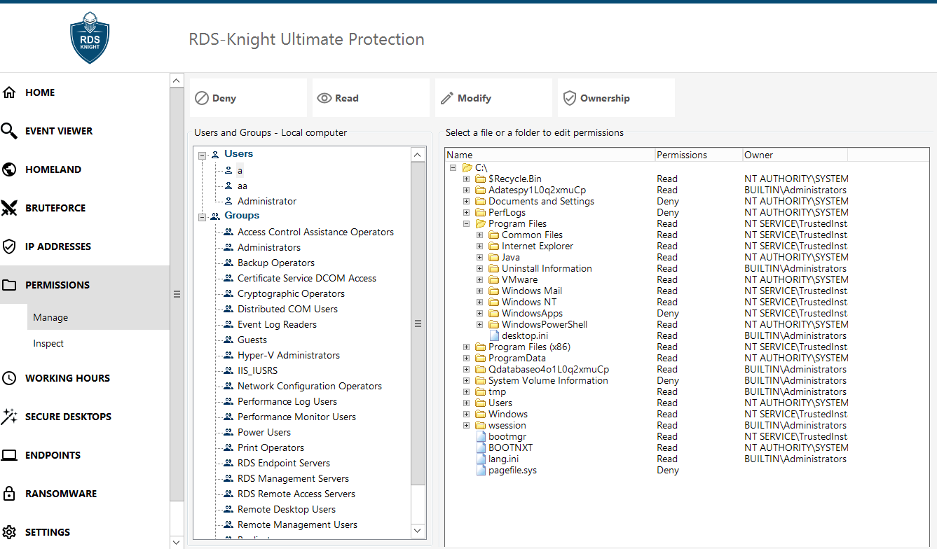 With version 4.3, RDS-Knight goes further: it introduces the very useful “Permissions” feature, which gives admins the necessary tools to limit user privileges in a matter of minutes. From the new “Permission” tab of RDS-Knight management console, admins will see the list of users and groups and the list of available folders side-by-side. Everything is visible in one spot, which makes it super easy to Inspect (RDS-Knight Essentials) and Edit (RDS-Knight Ultimate) privileges for one user at a time, increasing the accuracy of the restrictions.