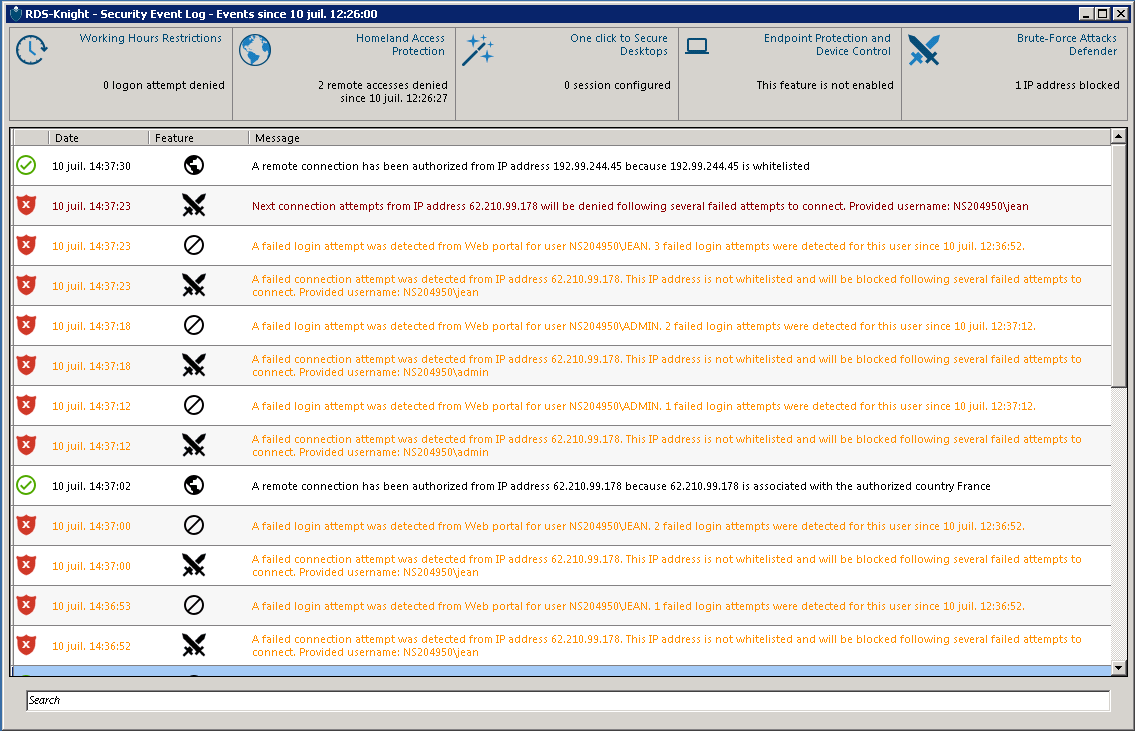 Administrators can quickly and easily review who’s responsible for using incorrect user names. Combined with the Brute-Force Defender, it’s a very efficient way to spot attackers who try to connect with the same IP using different user names.