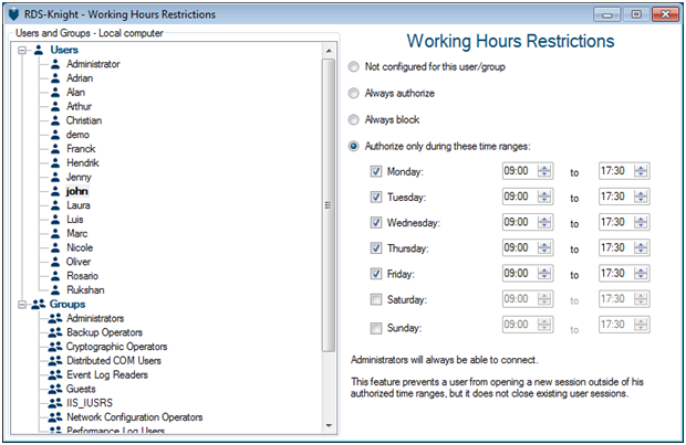 Thus, these time limitations will prevent your employees to remotely connect to your server with computer, tablet or Smartphone and even Internet during the night or whenever they are not supposed to.