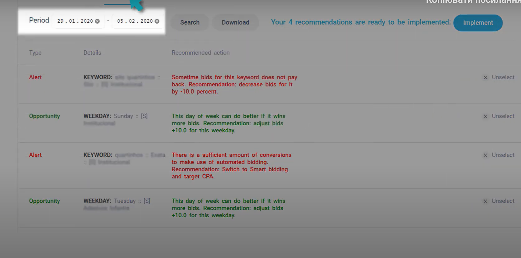 Immediate insights about problems and opportunities. RecommendMe’s virtual assistant constantly looks for the ways on how to improve Google Ads campaigns. AI never misses an issue or opportunity. It detects ineffective advertising campaigns in their early stages, preventing further any loss of money.