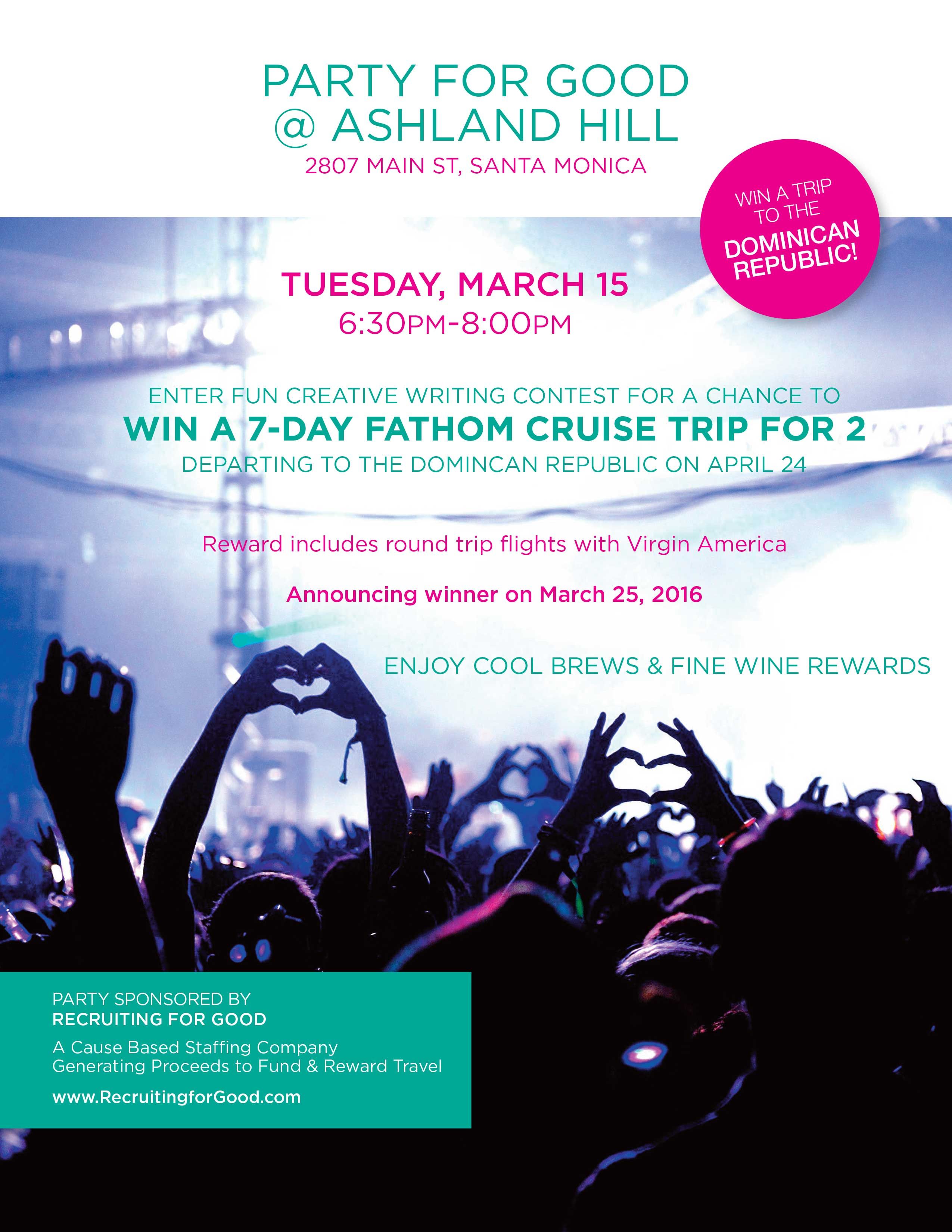 Santa Monica, California, April 12, 2016 (Newswire.com) - Recruiting for Good, a cause based staffing company, hosted five creative writing events and inspired 68 entries. The writing entries were independently judged for by David Andersen of David Andersen Pianos, and Michelle White Hart.