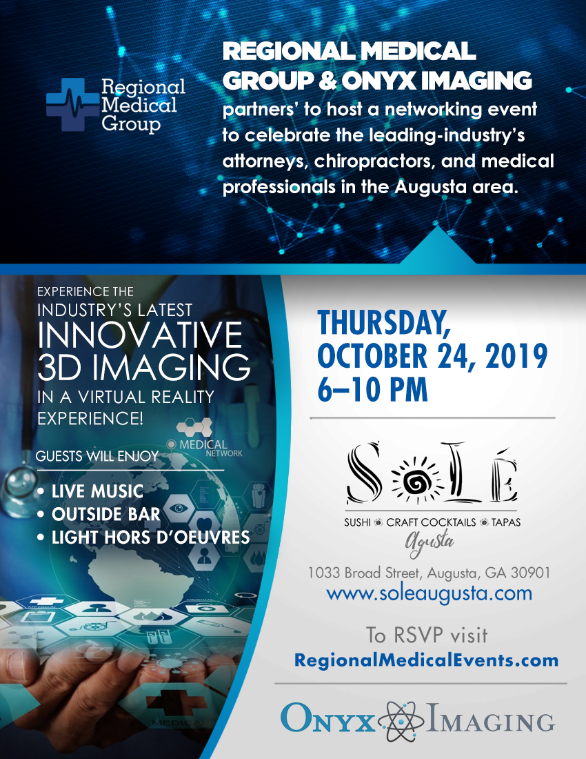 AUGUSTA, Ga., October 14, 2019 (Newswire.com) - Regional Medical Group and Onyx Imaging will be hosting a premier networking event to celebrate the industry’s leading attorneys, chiropractors, and medical professionals throughout the Augusta area.