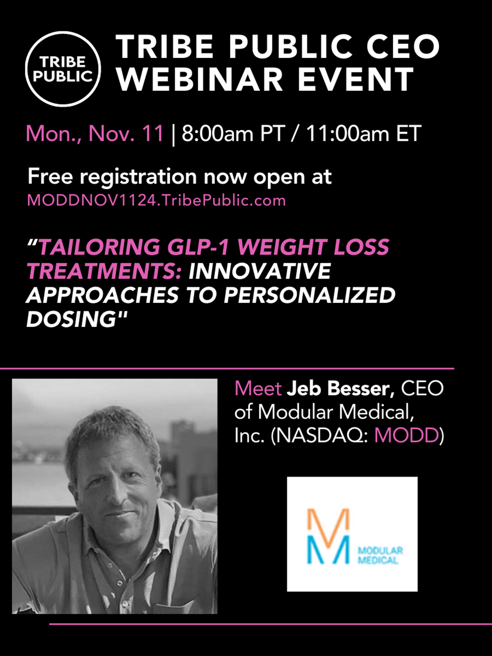 Registration Is Now Open For Tribe Public's Webinar Event "Tailoring GLP-1 Weight Loss Treatments: Innovative Approaches To Personalized Dosing" Featuring Modular Medical CEO On Monday, November 11, 2024