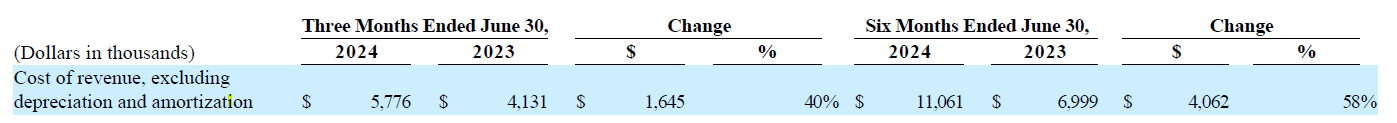 For the three and six months that ended June 30, 2024, the cost of revenue, excluding depreciation and amortization, increased compared to the corresponding prior periods primarily due to an increase in personnel and other direct costs, such as hardware, that were incurred to support our increase in revenue. Additionally, during the three and six months ended June 30, 2024, $970,000 and $1,799,000 of the increase was related to our acquisition of ATD.