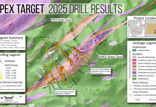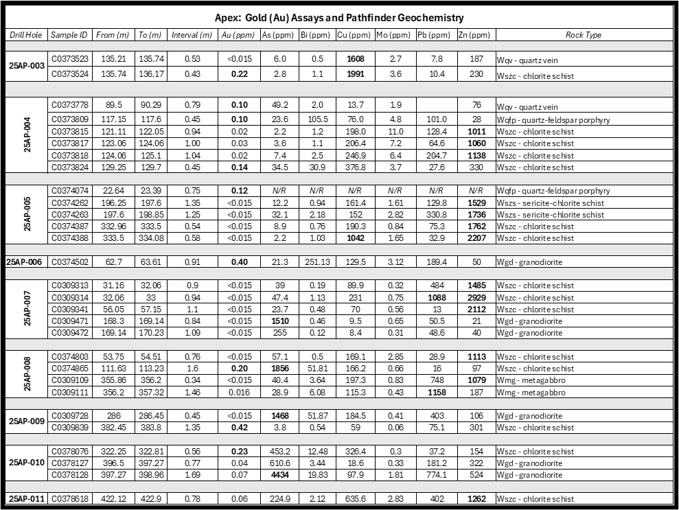 0.22 g/t Au and 0.19% Cu over 0.43 m in hole 25AP‑003 from 135.74 m to 136.17 m, adjacent to a >3 m quartz vein. This zone was cut where the strike and dip projection extends from the surface high-grade exposures, confirming a broad mineralizing shear corridor at Apex with the ability to carry high-grade gold (see Figures 1 and 2).