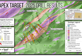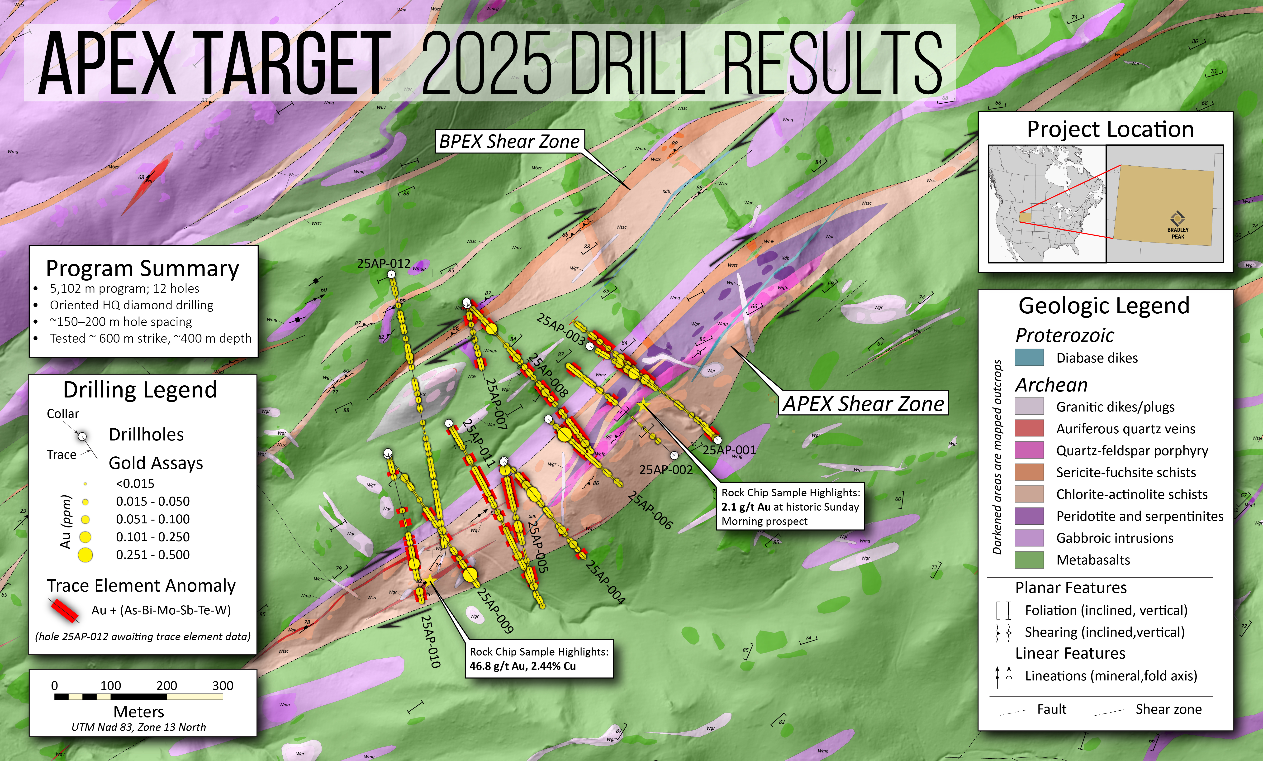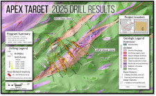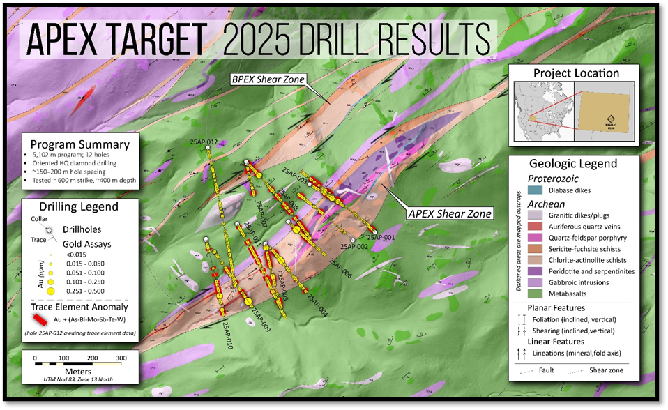 The 2025 program was designed to (1) test the vertical continuation of favorable host rocks and shear structures identified at surface, (2) evaluate the hanging wall and footwall contacts of the Apex shear, along with its overall structural geometry, (3) test the presence and continuity of hydrothermal alteration zoning and, (4) confirm the continuation of quartz-carbonate veining (See June 11, 2025 Press Release). The spacing of drill holes was intentionally broad (150-200m spacing) to evaluate system scale, continuity, and boundaries, and hole orientations were varied to determine dip on the shears.