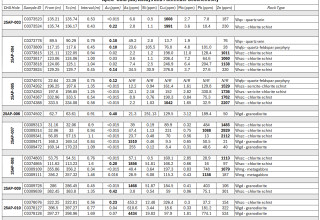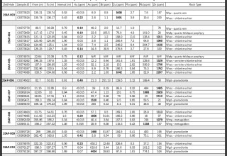 Figure 3: Table of gold (Au) assays and associated pathfinder geochemistry. All values listed are reporting in parts per million (ppm), and all intervals are listed as core lengths.