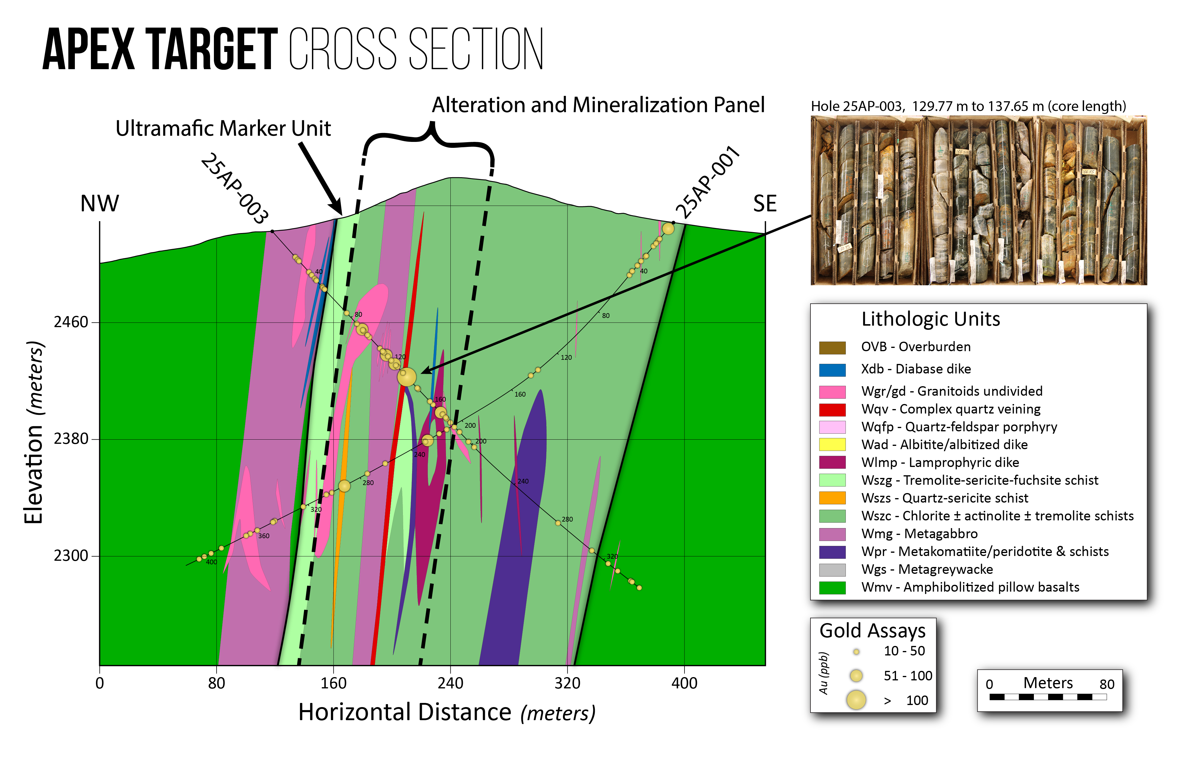 At Apex, this ultramafic unit provides an important marker horizon for tracking the main shear and vectoring toward higher‑grade zones along strike and down‑plunge.