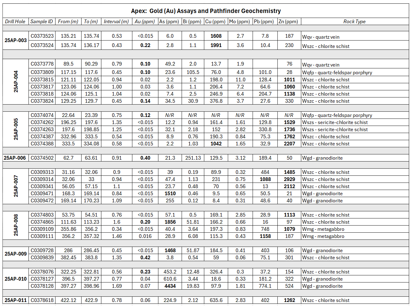 0.20 g/t Au over 1.60 m in hole 25AP‑008 from 111.63 m to 113.23 m.