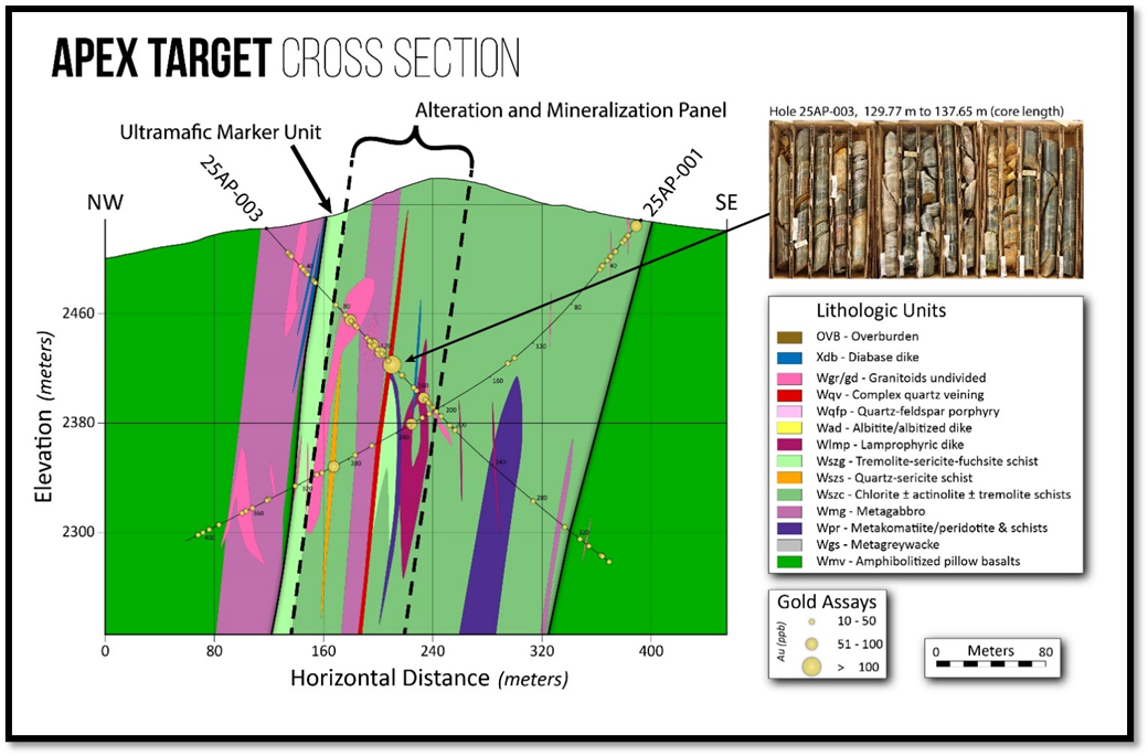 Figure 2. Cross-section illustrating broad mineralization and alteration panel at Apex marked by hydrothermal alteration, gold mineralization, and pathfinder element geochemistry. Upper right photo: Hole 25AP-003 Lower contact of Apex vein zone with oxidized vein salvage containing 0.22 g/t Au and 0.19% Cu over 0.43m core length at 135.74m hole depth. This zone was cut where the strike and dip projection extends from the surface high-grade exposures at Apex, confirming a broad mineralizing shear corridor at Apex with the ability to carry high-grade gold.
