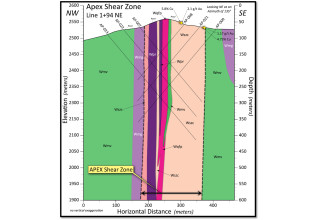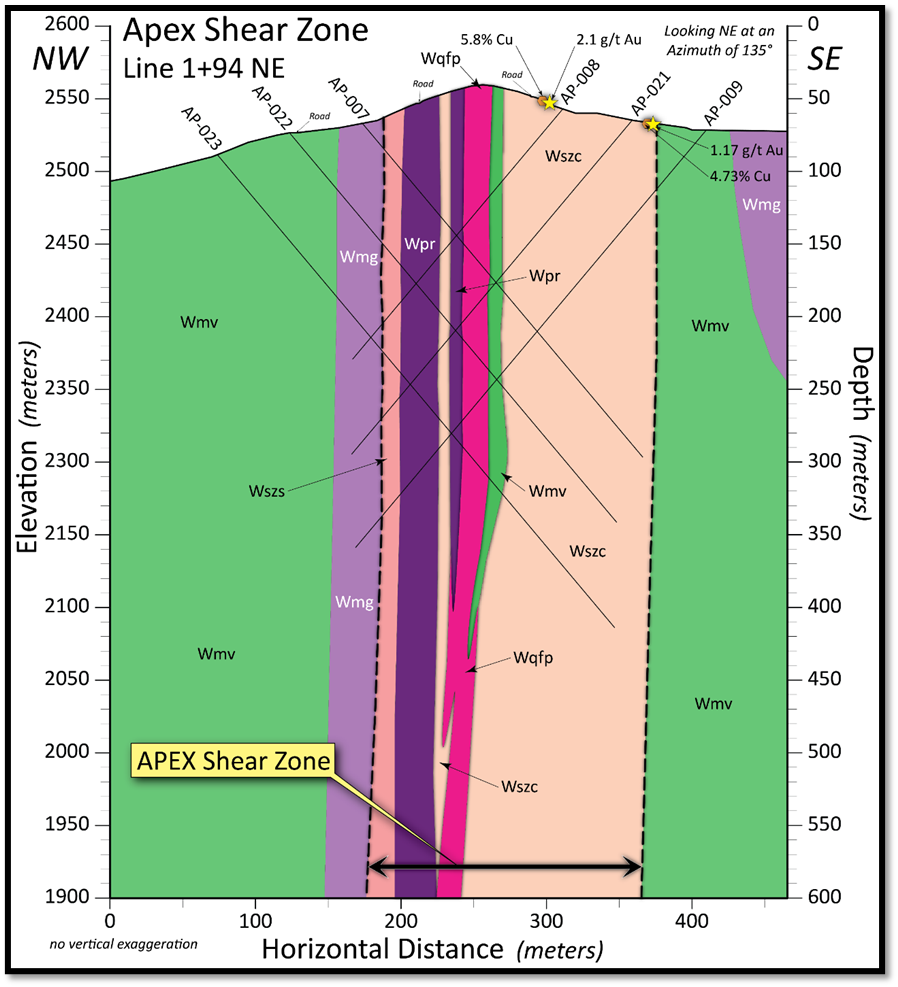 Figure 3: Conceptual cross section through the Apex Shear Zone, looking northeast at an azimuth of 135°. The section illustrates interpreted lithologies, major shear zones, and projected near-vertical conceptual drill traces from both sides. Locations of significant surface assay results are also annotated. The Apex Shear Zone is characterized by complex deformation and alteration, with high-grade copper and gold mineralization observed at surface.