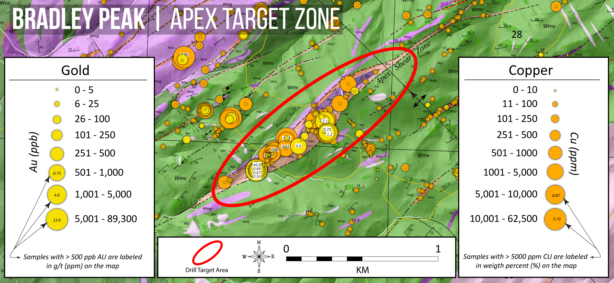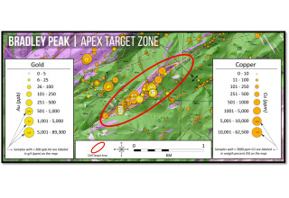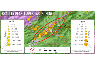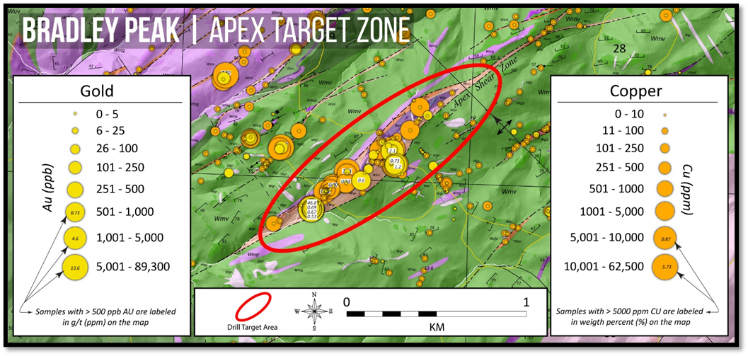 Figure 2: Map illustrating high-grade gold and copper assays from the Company's sampling programs at the >2.5km long Apex Target zone within the central Bradley Peak Gold Camp. Gold values range from >0.015 g/t to the highest-grade assay of 46.8 g/t Au. Copper values range from below detection limit ("BDL") to 7.8%. Red ellipse indicates the distinctive inflection zone along the shear and approximate drill target area. (link to larger version)