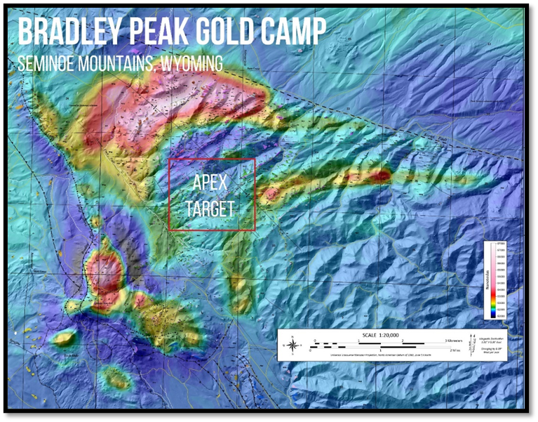 Figure 1: Plan view map of airborne magnetic anomalies draped over LiDAR at Relevant Gold's Bradley Peak Gold Camp. Apex lies right in the center of the >100km² fold hinge structure revealed by a detailed 2023 government-funded regional airborne geophysical survey.