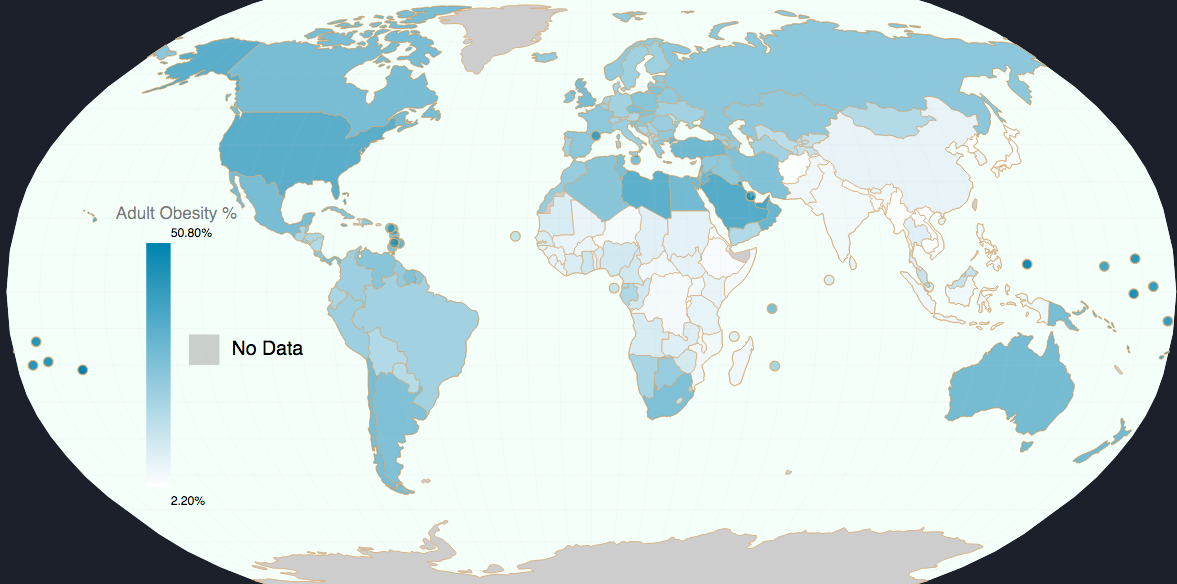 Even though China is the second largest adult obesity country, obesity affects only 6.9%. Likewise, nearby countries like Thailand, Japan, and India, all have significantly low obesity rates. Suggesting that obesity is affecting specific regions more than other areas.